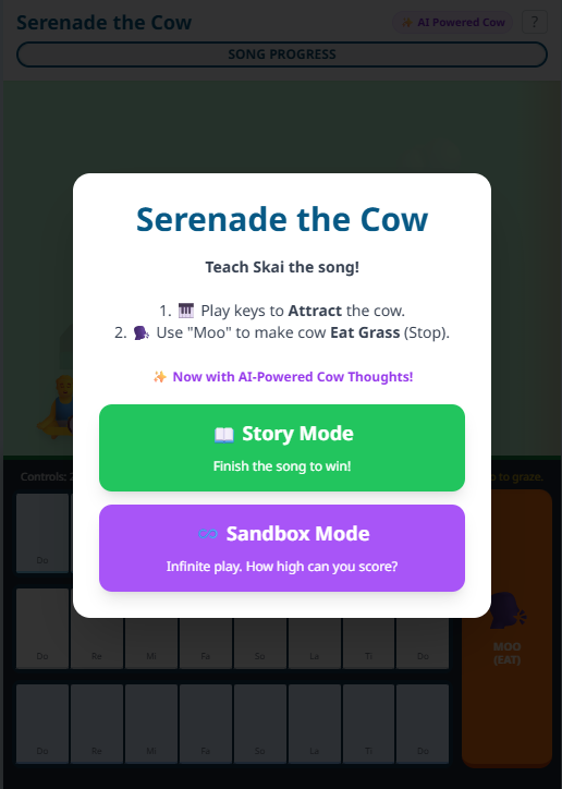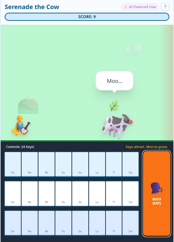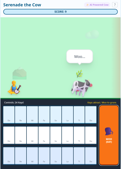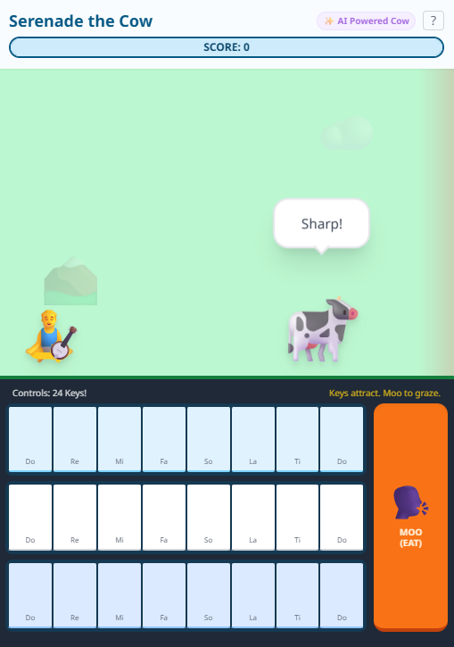 I just released a new web game, Serenade the Cow, a playful interactive experience based on the ancient Chinese idiom Duì Niú Tán Qín (对牛弹琴), which literally translates to "playing the lute to a cow."